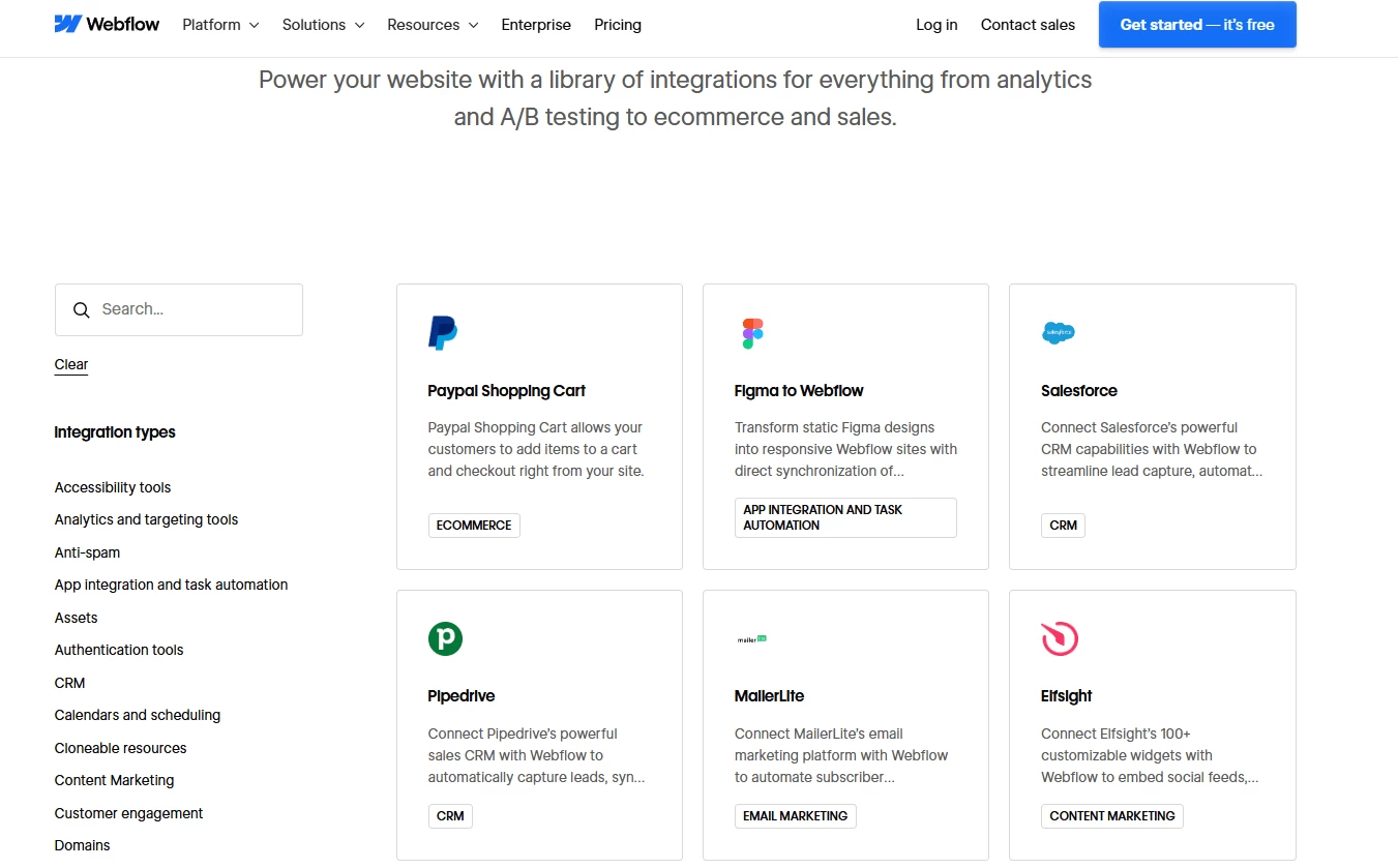 When it comes to adding new features to your website, Webflow and WordPress take very different paths. Webflow doesn’t have the traditional plugin ecosystem that WordPress does. Instead, it offers a range of widgets and third-party integrations to enhance your site. These include tools for maps, CRM connections, advanced contact forms, community platforms like Pensil, banner design with Bannernote, chatbots via Ideta, and appointment scheduling through Taskio, among others. You can also embed custom code, giving developers some extra flexibility to integrate niche features. That said, most Webflow integrations are best suited for small enhancements rather than completely transforming what your website can do.